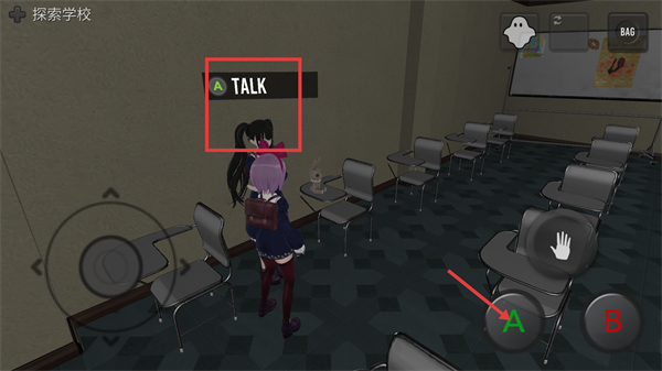 2、看到界面的【TALK】提示后,操控角色靠近双马尾角色,点击【A】按钮触发互动,获取对应的剧情相关线索。