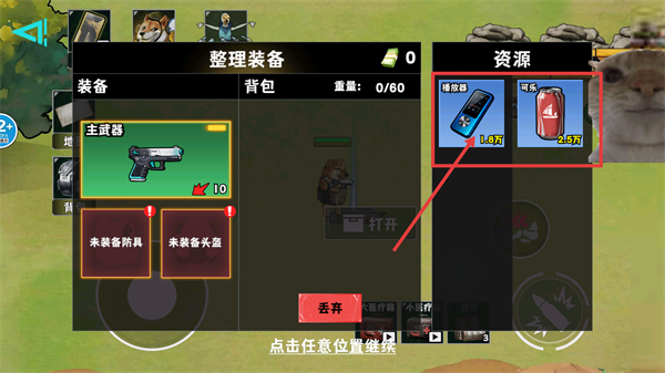 3、进入【整理装备】界面,可查看【主武器】配置,同时管理背包内【智能手机-1.0万】等资源,留意背包重量【0/60】的限制。
