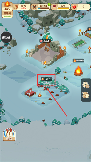 1、处于【-10℃】环境,木材当前【3.7k】,点击【Lv.1】建筑推进【任务】,维持资源与设施的发展节奏。