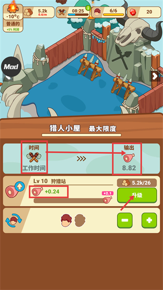 3、在【猎人小屋-最大限度】界面,升级【Lv.10-狩猎站】消耗对应资源,点击【升级】增强狩猎相关产出。