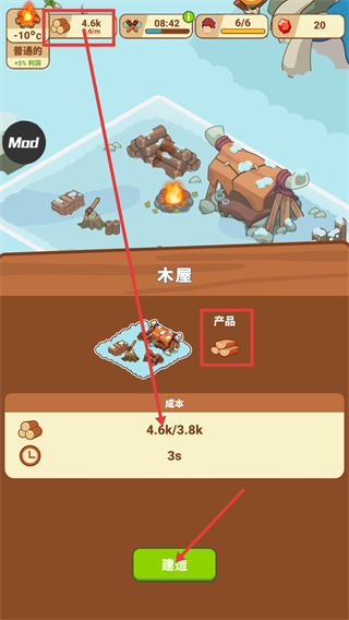 4、进入【木屋】界面,消耗【4.6k/3.8k-木材】等待【3s】,点击【建造】获取对应产品补充资源。