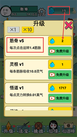 1、处于【散修】阶段时,在【升级】界面选【筋骨v5-每次点击运转1.4筋脉】,消耗【2】个对应道具提升属性。