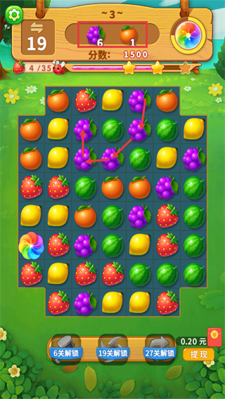 2、本关需完成【葡萄-6】【橙子-1】的收集目标,当前【分数-1500】,【草莓-4/35】进度待提升,优先消除聚集的【葡萄】。