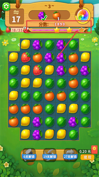 3、完成【葡萄】收集后分数升至【1890】,【草莓-18/35】进度加快,可瞄准聚集的【橙子】【柠檬】继续消除提升效率。