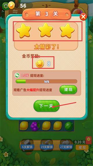 4、通关【第3关】获得【金币奖励-8】,【0.3元-提现进度-16%】,点击【下一关】继续挑战,可看广告提升提现进度。