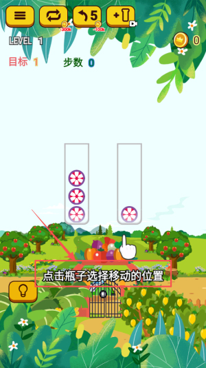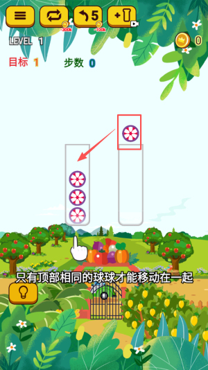 1、开启闯关准备:选择目标关卡,熟悉水果移动操作方式,观察试管中水果分布与颜色组合,明确 “同类归置” 的核心目标。