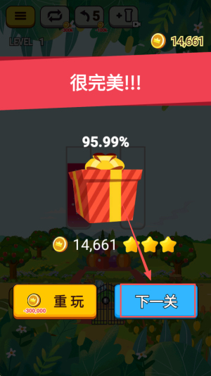 4、完成通关:在14.661很完美!!!95.99%界面点击下一关继续挑战。