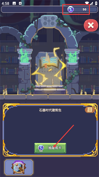 1、使用【50-钻石】可抽取【石器时代建筑包】中的建筑卡,找到界面中的【抽建筑卡】按钮点击即可参与抽取。