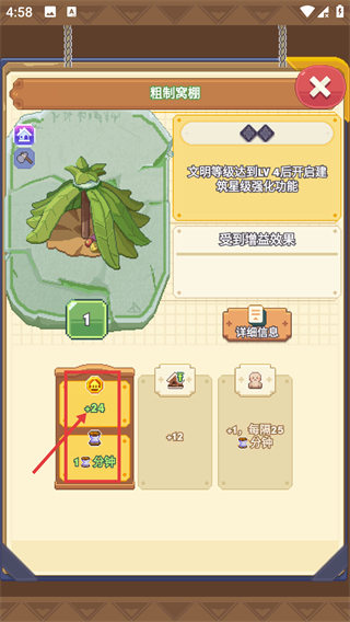 3、【粗制窝棚】可提供【+24-资源】,每【1-分钟】结算一次,文明等级达到LV4后能开启星级强化功能。