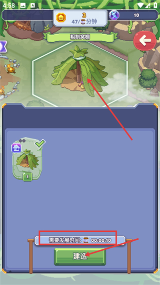 4、建造【粗制窝棚】需要【00:00:10-发展时间】,点击界面中的【建造】按钮即可启动该建筑的建造流程。