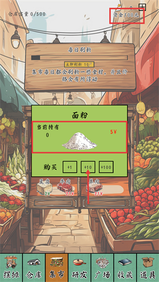 4、进入【集市】界面,以【5元】的价格购买【面粉】,集市每日刷新食材且价格浮动,需按需采购摆摊食材。