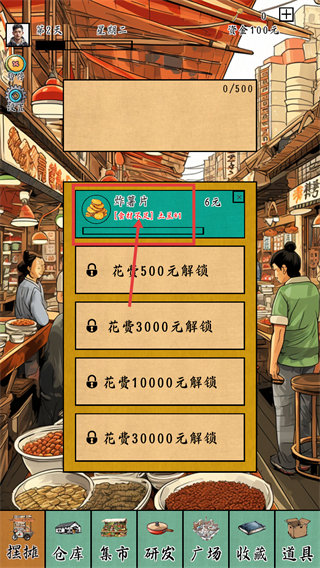 1、第2天持有【资金-100元】,摆摊时【炸薯片】提示【食材不足-土豆#1】,其余小吃需按对应资金门槛解锁,需先补充食材。