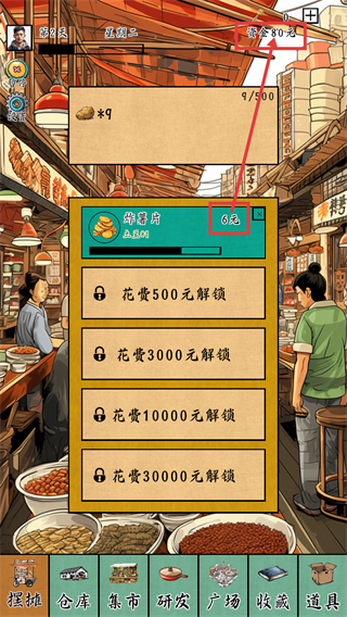 3、购土豆后资金变为【80元】,仓库有【土豆-*9】,此时【炸薯片-6元】食材条件达标,可开启该小吃的摆摊售卖。