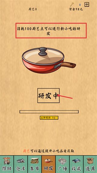 4、进入【研发】界面,需积累【100-厨艺点】研发新小吃,厨艺点可通过提升小吃品质获取,当前处于研发流程中。