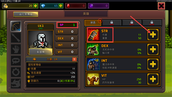 1、在角色界面,利用【SP-1】点数,点击【STR】旁的+号提升【伤害-重量】属性,同步强化【力量-14】等基础战斗能力。