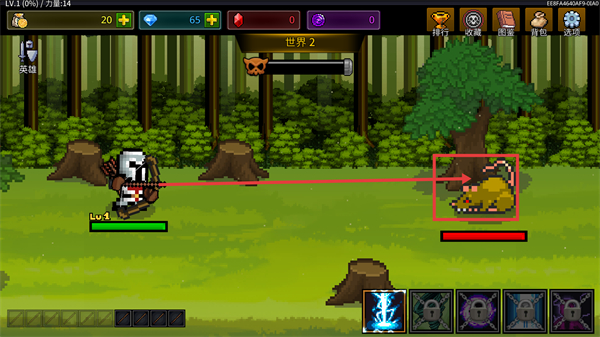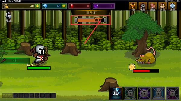 4、在【世界2】持续战斗,推进顶部带骷髅头的进度条,同时积累【金币-40】,为角色后续的属性强化储备资源。