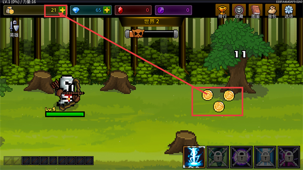 3、击败怪物后,拾取场景内掉落的金币,可看到左上角【金币-21】数量提升,积累该资源用于后续角色属性升级。