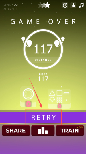 4、结束重来:在LEVEL1/55 GAME OVER 117界面点击RETRY继续挑战。