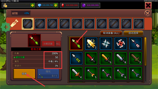 3、在装备界面选择【若虫之箭】,其附带【伤害-200%】【中毒-4%】等属性,点击【使用】装备以提升角色输出能力。