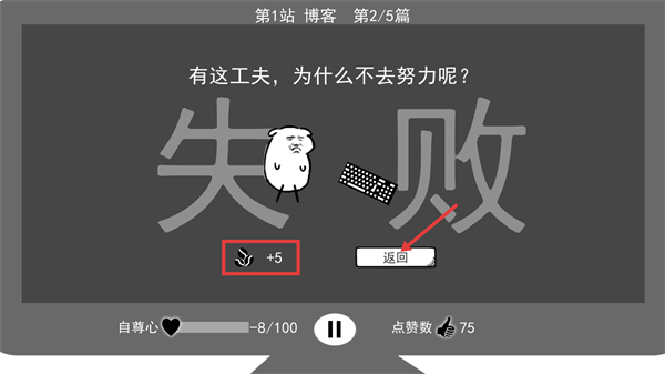 2、在博客关卡进程中,会出现负面元素,这类内容会降低【自尊心】数值,需留意其出现频率,提前做好数值维稳的准备。