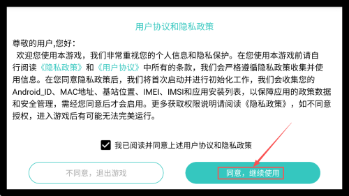 1、接受隐私政策:在游戏启动时,阅读并勾选同意用户协议和隐私政策,点击“同意,继续使用”进入游戏。
