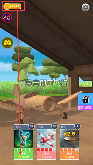 1、进入界面先留意【2970】金币,看到【点击即可飞行】提示,可升级【弹弓-15-升级-2209】强化。