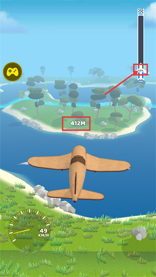3、飞行过程中关注【412M】的当前距离,保持【49-KMH】的速度,朝着界面中标注的目标区域前进,推进飞行阶段任务。
