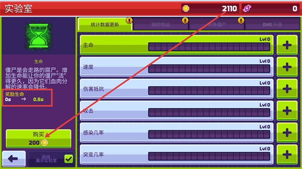 1、在【实验室】界面,使用【2110】金币点击【购买-200】,提升【生命】属性以降低僵尸血肉分解速率,还可升级其他属性增强僵尸能力。