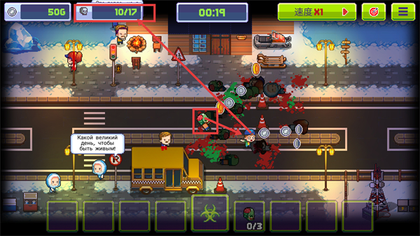 3、场景中已达成【10/17】的击杀进度,同时获取【50G】金币,操控僵尸持续感染剩余人类,进一步推进任务完成度。