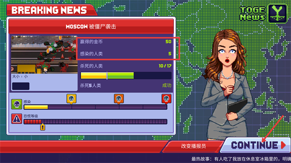 4、任务完成后出现【BREAKING-NEWS】,显示【MOSCOW-被僵尸袭击】,获得【50-赢得的金币】,点击【CONTINUE】进入后续环节。