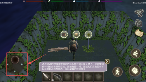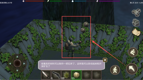 3、收集资源:根据游戏提示,收集场景中的资源,如石头和木材,为生存做准备。