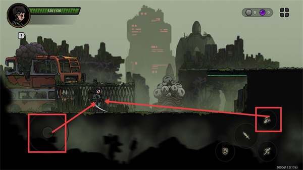 2、操控界面左侧【移动按钮】控制角色移动,点击右侧【手套图标】可交互场景物品,注意左上角【120/120-生命值】状态保持满值更安全。
