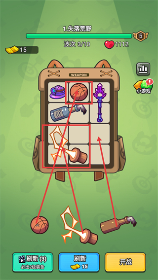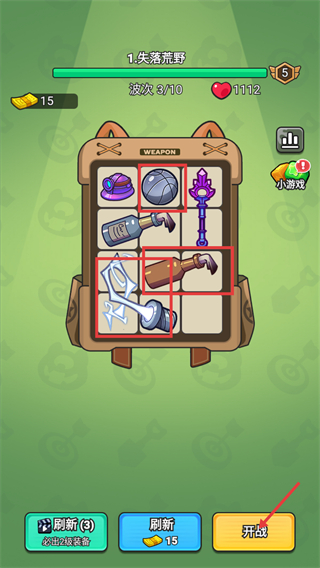 2、在【失落荒野-波次3/10】背包界面,合成升级【篮球】等装备,强化输出道具后,点击【开战】进入该波战斗。