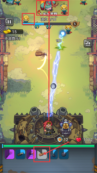 3、处于【失落荒野-波次3/10】战斗,借助装备技能攻击敌人,关注【杀敌数-61】与【生命值-1112】,保持输出节奏。