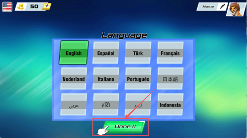 1、设置语言:在游戏设置界面,选择“English”作为游戏语言,然后点击“Done!!!”。