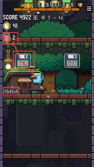 1、在【关卡1-3】操控蓝色小鸟收集场景内的【胡萝卜】,同时确认【存档点】已存档,提升资源的同时保障进度不丢失。