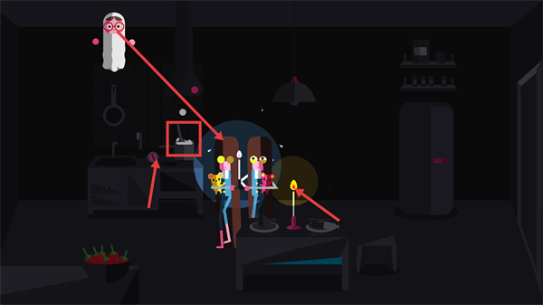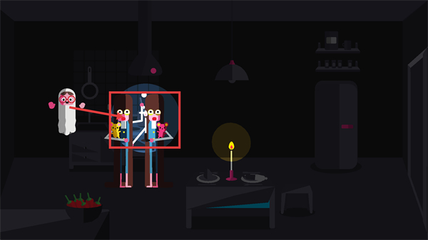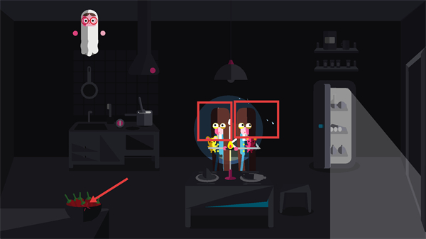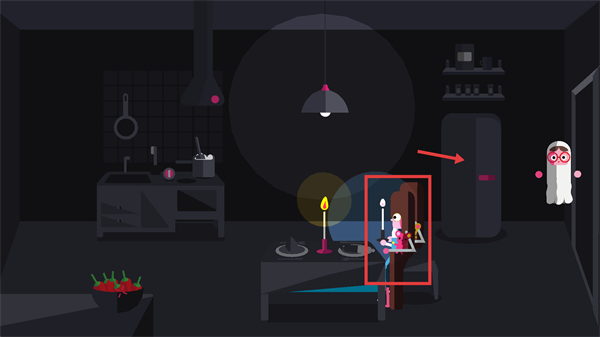 1、在厨房场景中,操控角色留意【幽灵装扮-红眼镜角色】,靠近【带蜡烛的椅子】触发交互,同时关注场景内的【冰箱】待后续操作。