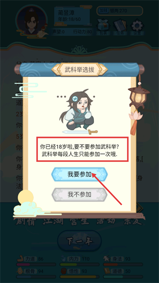 1、18岁触发【武科举选拔】,该活动每段人生仅能参加一次,点击【我要参加】按钮开启武科举挑战。