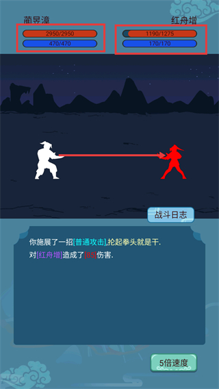 2、进入武科举战斗环节,使用【普通攻击】对【红舟增】造成伤害,可借助【5倍速度】功能加快战斗进程。