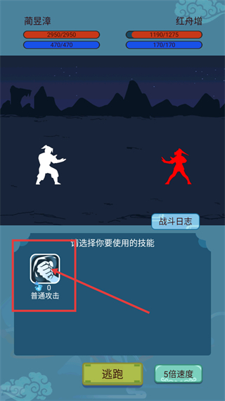 3、战斗中技能选择界面,点击【普通攻击】技能进行输出,也可根据情况选择【逃跑】退出战斗。