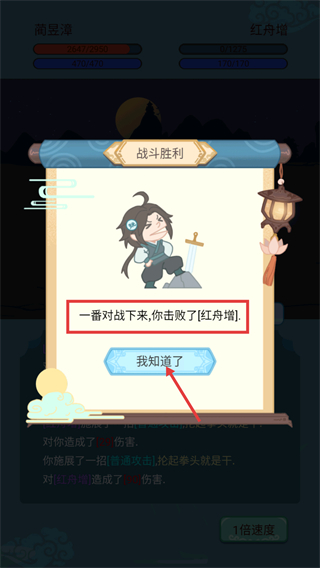 4、成功击败【红舟增】后显示【战斗胜利】,点击【我知道了】按钮关闭提示,推进武科举后续流程。