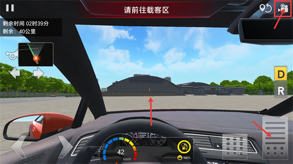 2、进入驾驶界面后,按【请前往载客区】的提示操控车辆,留意剩余02时39分的时间与40公里的行程距离。