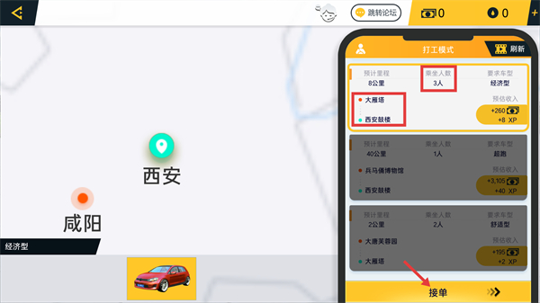 1、在打工模式中选择【大雁塔-西安鼓楼】8公里订单,该订单乘3人、要求经济型,点击【接单】可接取并获得+260收入与+8XP。