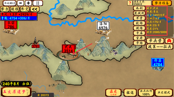 1、关注【武关-3514】的兵力与资源,借助右侧【政策--征兵】功能提升征兵速度,同时留意【长安-786】等城池的兵力状态。