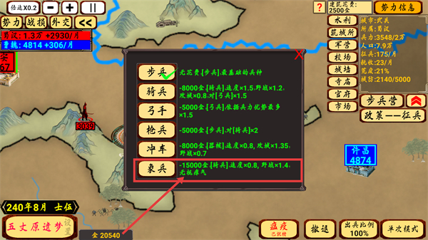 2、在兵种界面选择【象兵】,其需【15000金】且具备无视瘴气的效果,可搭配基础兵种增强战场战力。