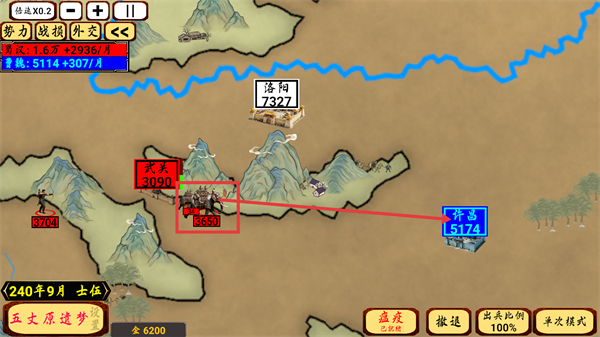 3、调遣【3650】兵力的象兵部队,向【许昌-5174】推进,同时留存【武关-3090】的兵力保障后方区域安全。