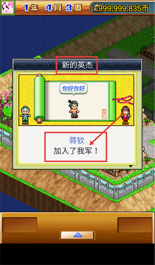 1、界面显示【新的英杰】,角色【蒋钦】加入了我军,这是扩充我方战力的新角色,后续可配置其参与战斗。