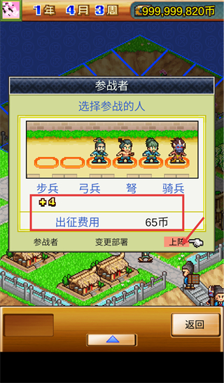 3、进入【参战者】界面,步兵属性+4,消耗【65币】出征费用,点击【上阵】按钮派出配置好的部队。