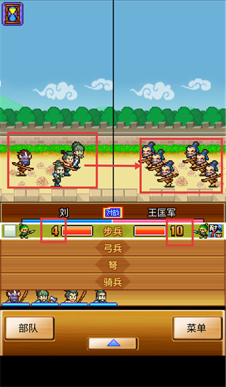 4、对战时留意我方与【王匡军】的步兵兵力数值(我方4、敌方10),依托部队配置推进本次战斗进程。