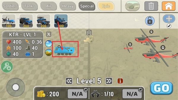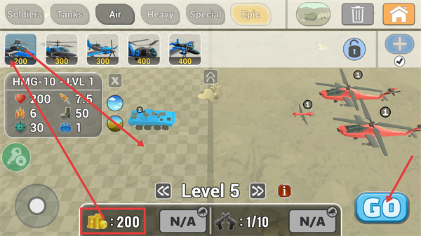 2、切换至【Air】栏选用【HMG-10-LVL-1】直升机,消耗200-金币完成部署,做好开启【Level-5】战斗的准备。